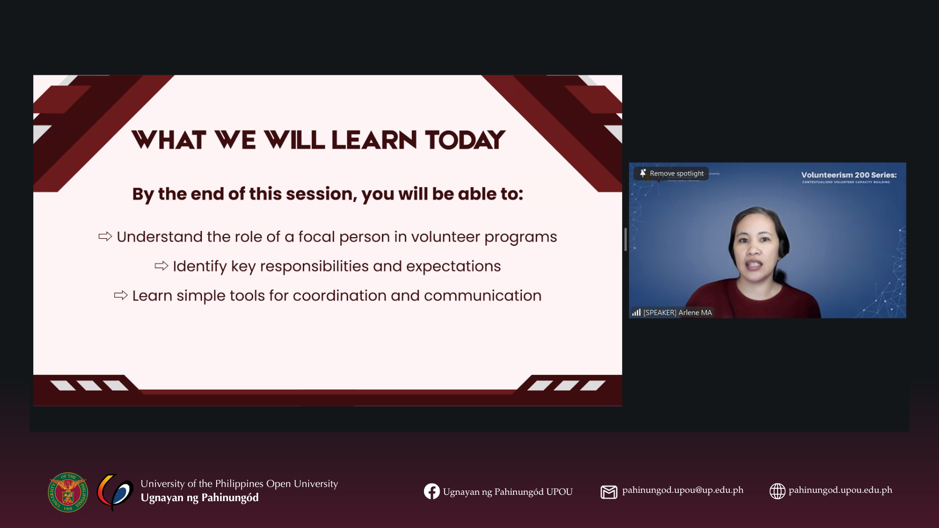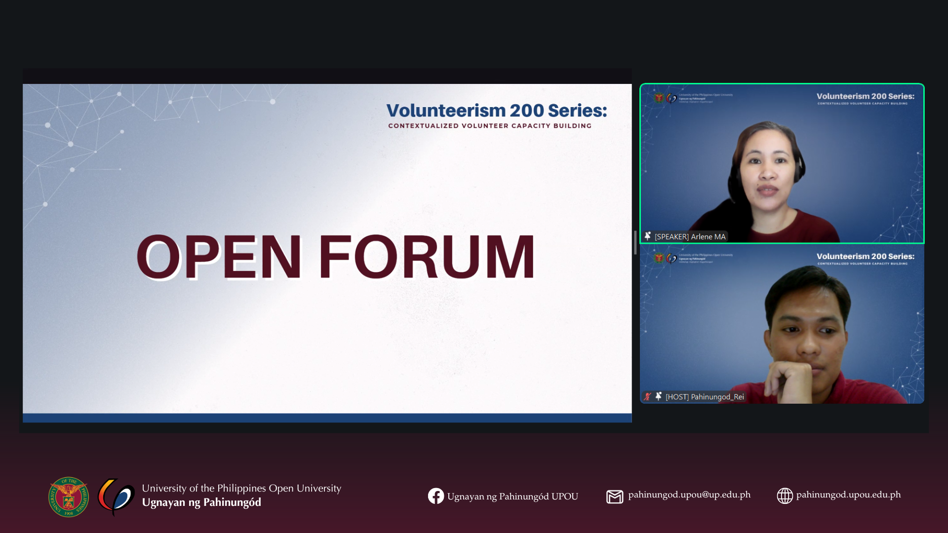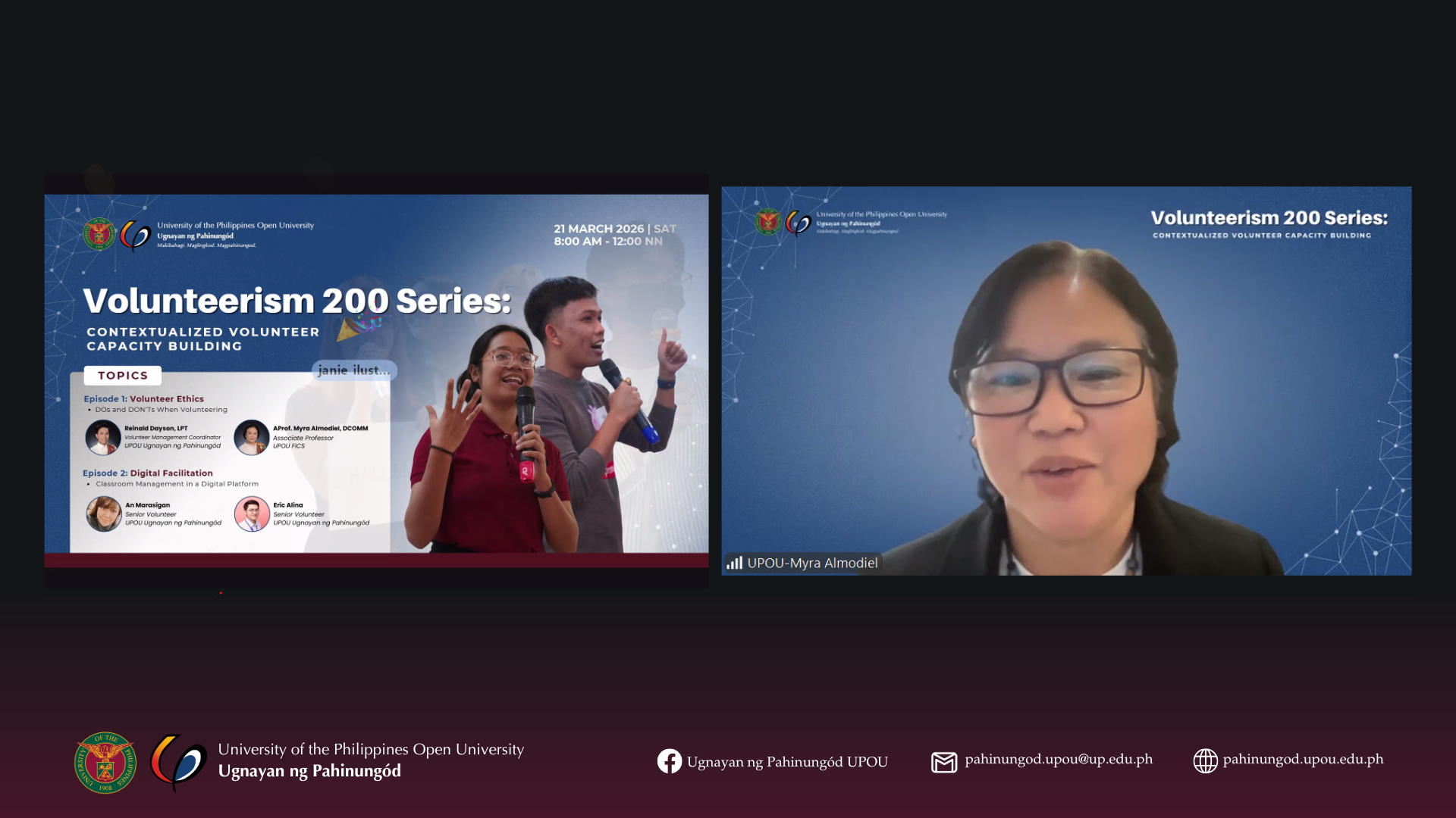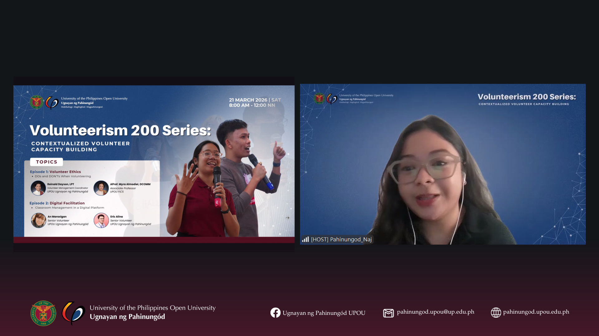 Bilang tugon sa pangangailangang ito, nagsagawa ang University of the Philippines Open University (UPOU) Ugnayan ng Pahinungód ng isang training na pinamagatang “Volunteerism 200 Series: Contextualized Volunteer Capacity Building” noong ika-21 at 28 ng Marso 2026, via Zoom. Tinalakay sa apat na episodes ang mahahalagang paksa tulad ng (1) Volunteer Ethics and Combating Misinformation and Disinformation, (2) Digital Facilitation, (3) Roles and Responsibilities of a Focal Person, at (4) Designing PubMats and Article Writing. Dinaluhan ito ng mahigit isang daang boluntir, mga baguhan at beterano mula sa iba’t-ibang lugar, na naglaan ng oras upang matuto at magbahagi.