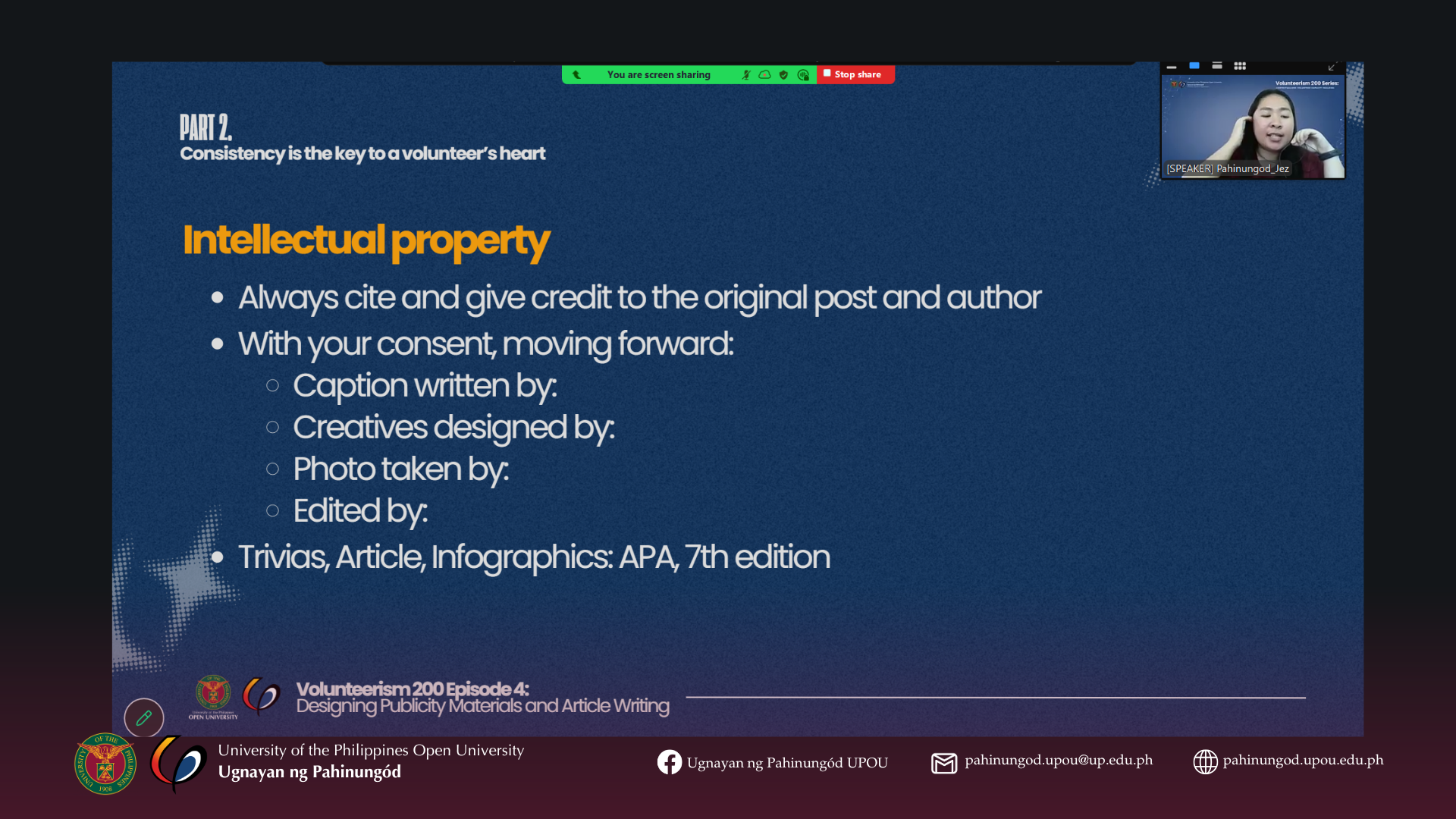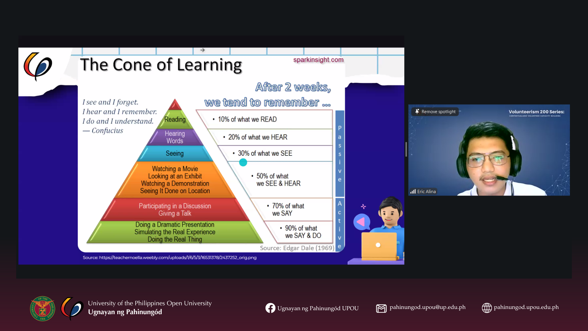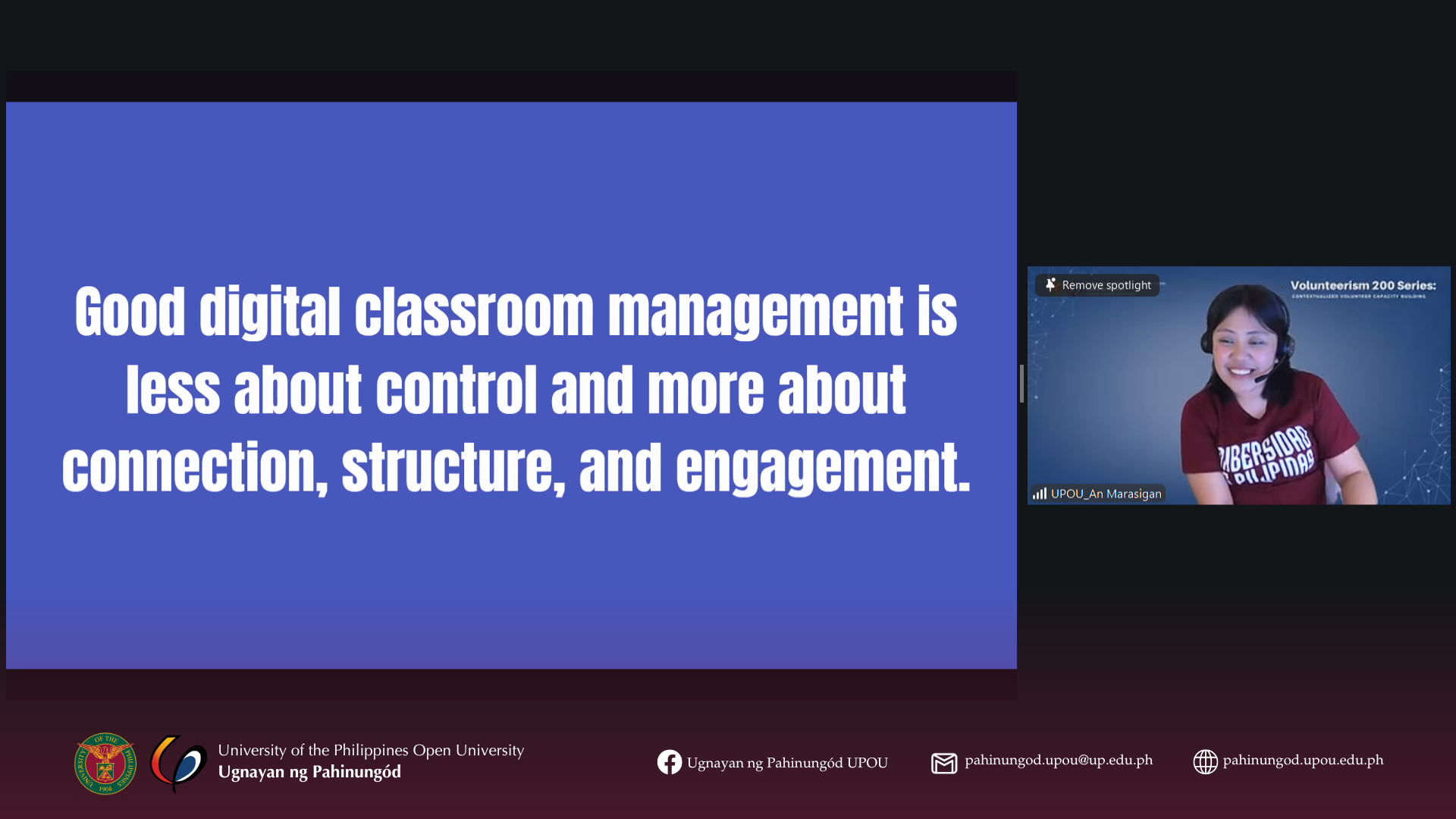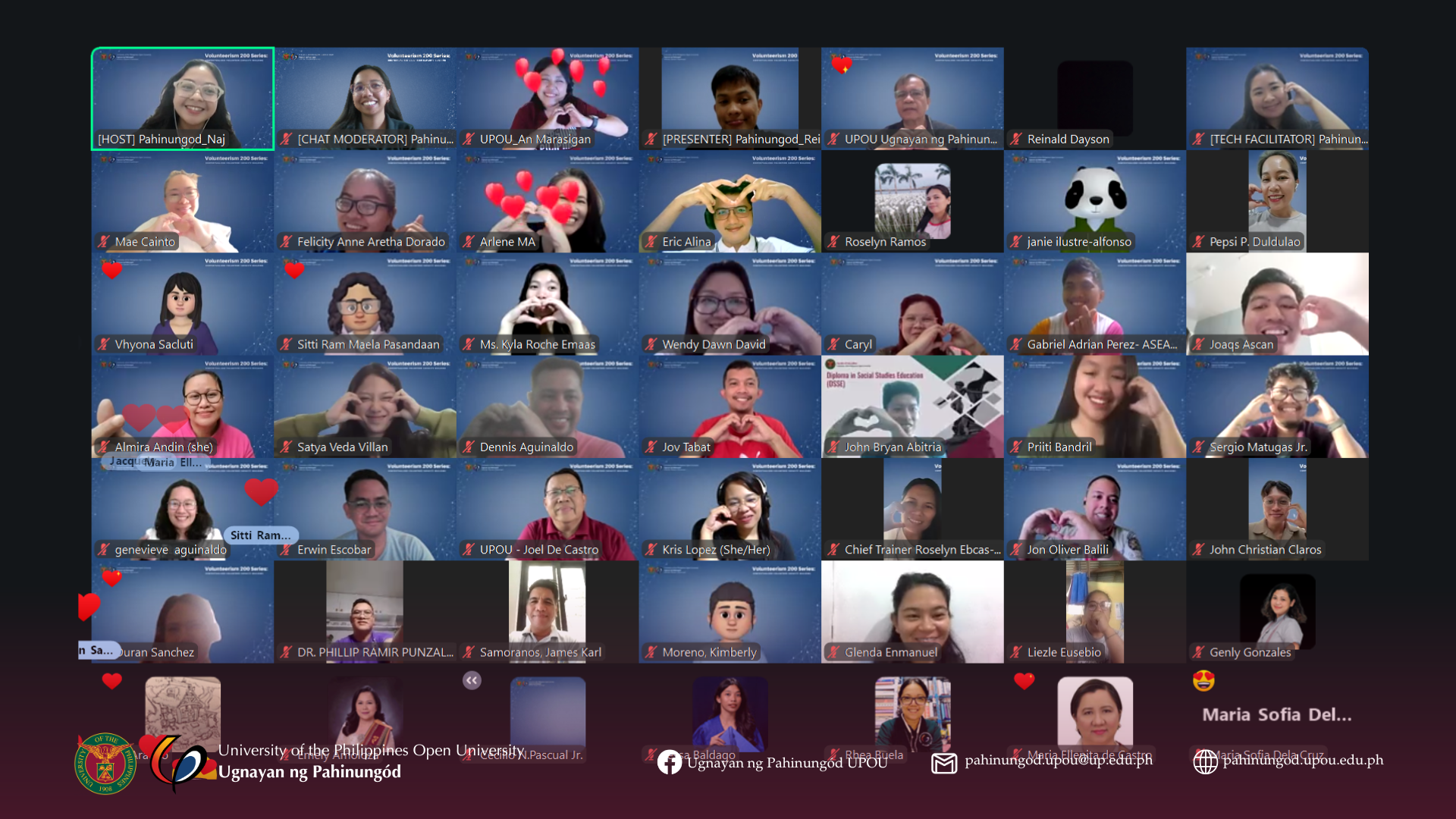 Sa loob ng apat na oras kada araw, naging masigla ang palitan ng karanasan at kaalaman. Hindi lamang ito naging makabuluhan para sa mga kalahok, kundi maging sa mga tagapagsalita. Pinangunahan nina G. Reinald Dayson, Volunteer Management Coordinator ng UPOU Pahinungód, at Associate Professor Myra Collado Almodiel, Program Chair ng Master of Development Communication ng UPOU Faculty of Information and Communication Studies, ang talakayan sa Episode 1. Samantalang sina Bb. An Marasigan, G. Eric Alina at Gng. Arlene Mendiola-Acol, mga Senior Volunteers ng UPOU Pahinungód ang nanguna para sa Episode 2 at 3. Sina Bb. Naomi Jean Unlayao at Bb. Jezreel Anne Cometa, kapwa UPOU Pahinungód Staff para sa talakayan ng Episode 4.
